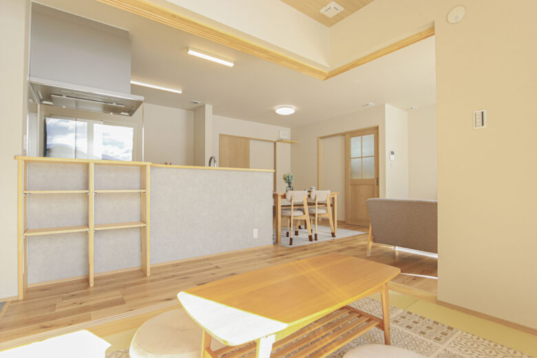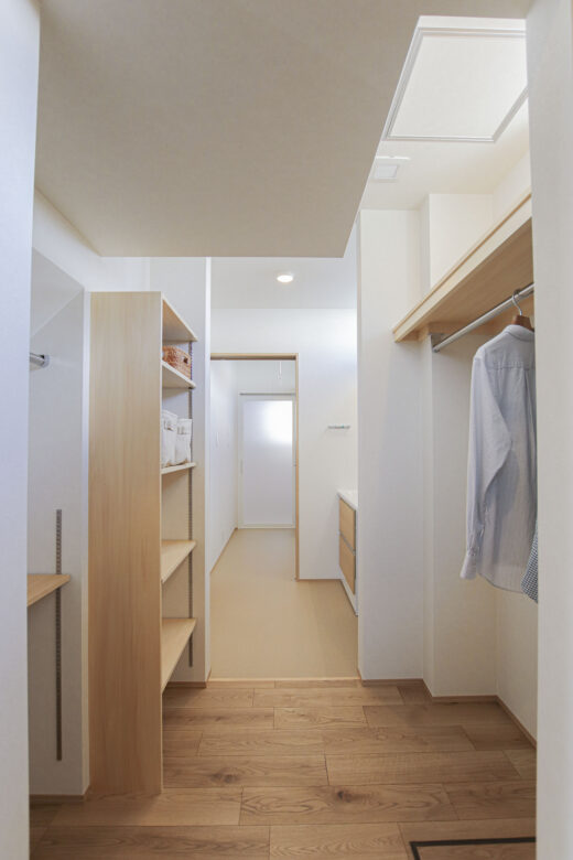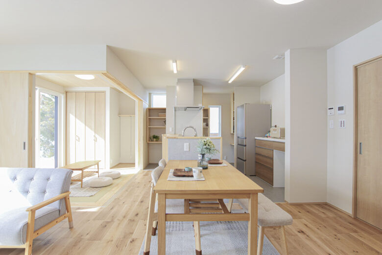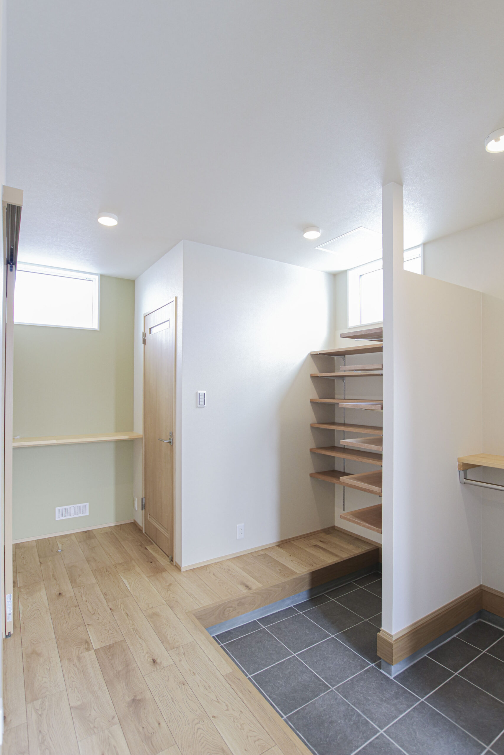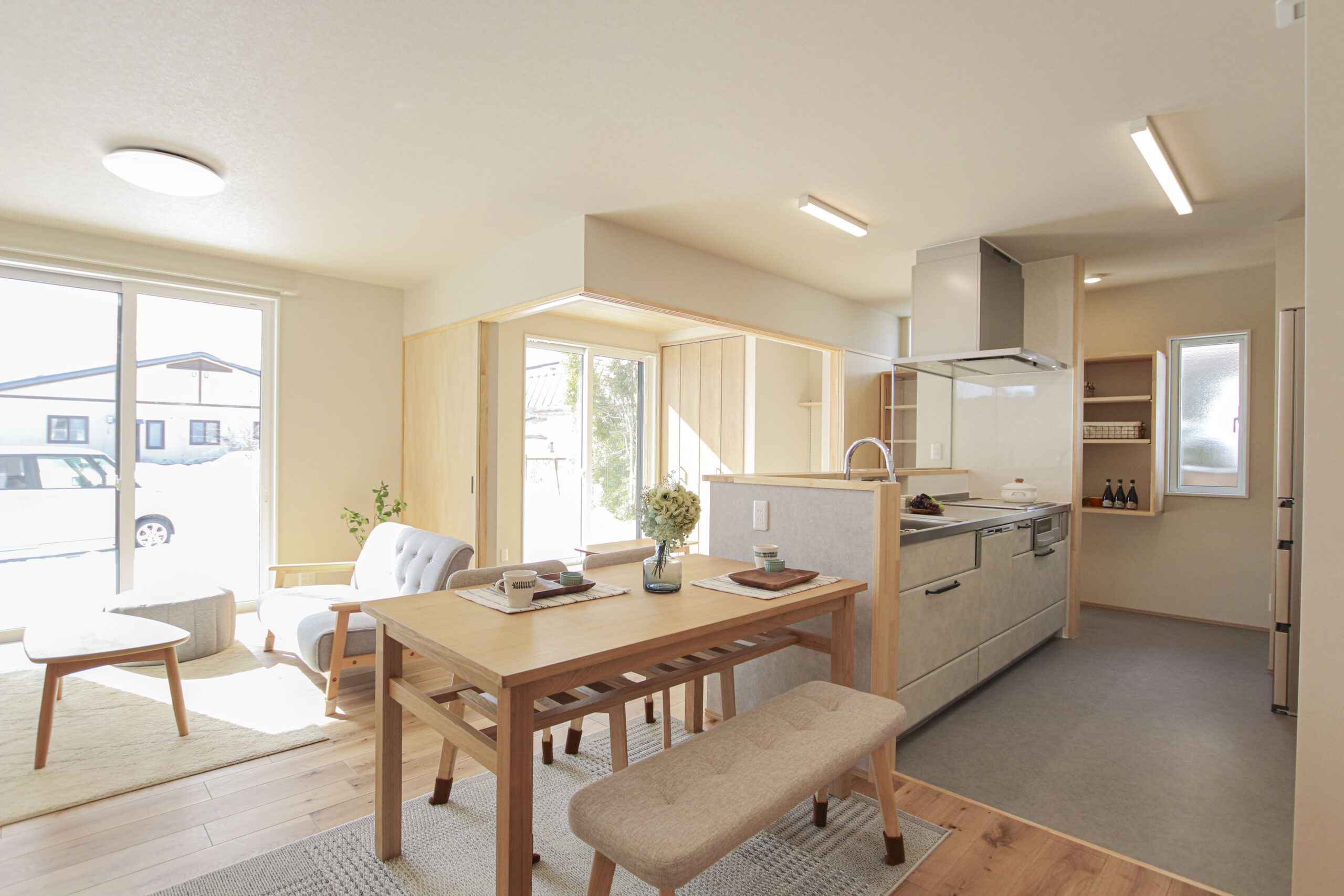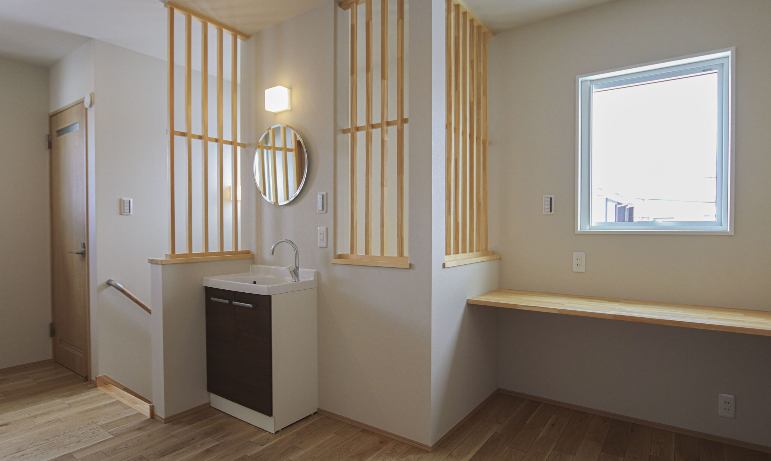 子育て世代の家事ラクな家 2025年3月12日 家族構成 単世帯 建物構造 木造軸組SW工法 延床面積 123.38㎡ 37.32坪 坪単価 所在地 会津若松市 玄関⇨S.C.⇨洗面までのただいまスムーズ動線や キッチンからぐるっと通り抜けできるパントリーなど 子育ても家事もしやすいお家できました! 建物の特長 北海道基準以上の性能 ( UA値 0.38 C値 0.3 ) 長期優良住宅 耐震等級3 土台・柱 全て桧 玄関ホール 広々とした玄関ホール 右手側にはシューズクローク 奥にはトイレ 左側には水廻りがあり 帰宅後の動線がスムーズになるよう 工夫された水廻り 水廻り 直線的に配した水廻り 玄関を入り奥へ進むと そのまま着替えや手洗いができちゃいます キッチン キッチン奥にはパントリーを設けました キッチン側からも和室側からも 通り抜けできる家事楽な動線です パントリー パントリー内にはワークスペースを設けました 畳コーナー キッチンの前に設けた約3帖の畳ペース 造作の引き戸を閉めれば 個室としても使用できるので 来客スペースとしても♪ LDK 壁紙はホワイトでまとめてスッキリと 床材や建具を明るい木目で合わせ ナチュラルな雰囲気のLDKは約17帖 2F ホール 2Fホールに設けた手洗いとカウンタースペース 階段部分の格子による抜け感と採光が 心地いい空間に* 2F 寝室-1 ハイドアで仕切れるようにした約8.5帖の寝室 2F 寝室-2 ドアを閉めればそれぞれの個室に! クローゼットやドアも2ヶ所ずつあるので、 お互いの生活リズムが異なる時でも 快適に過ごせます♪