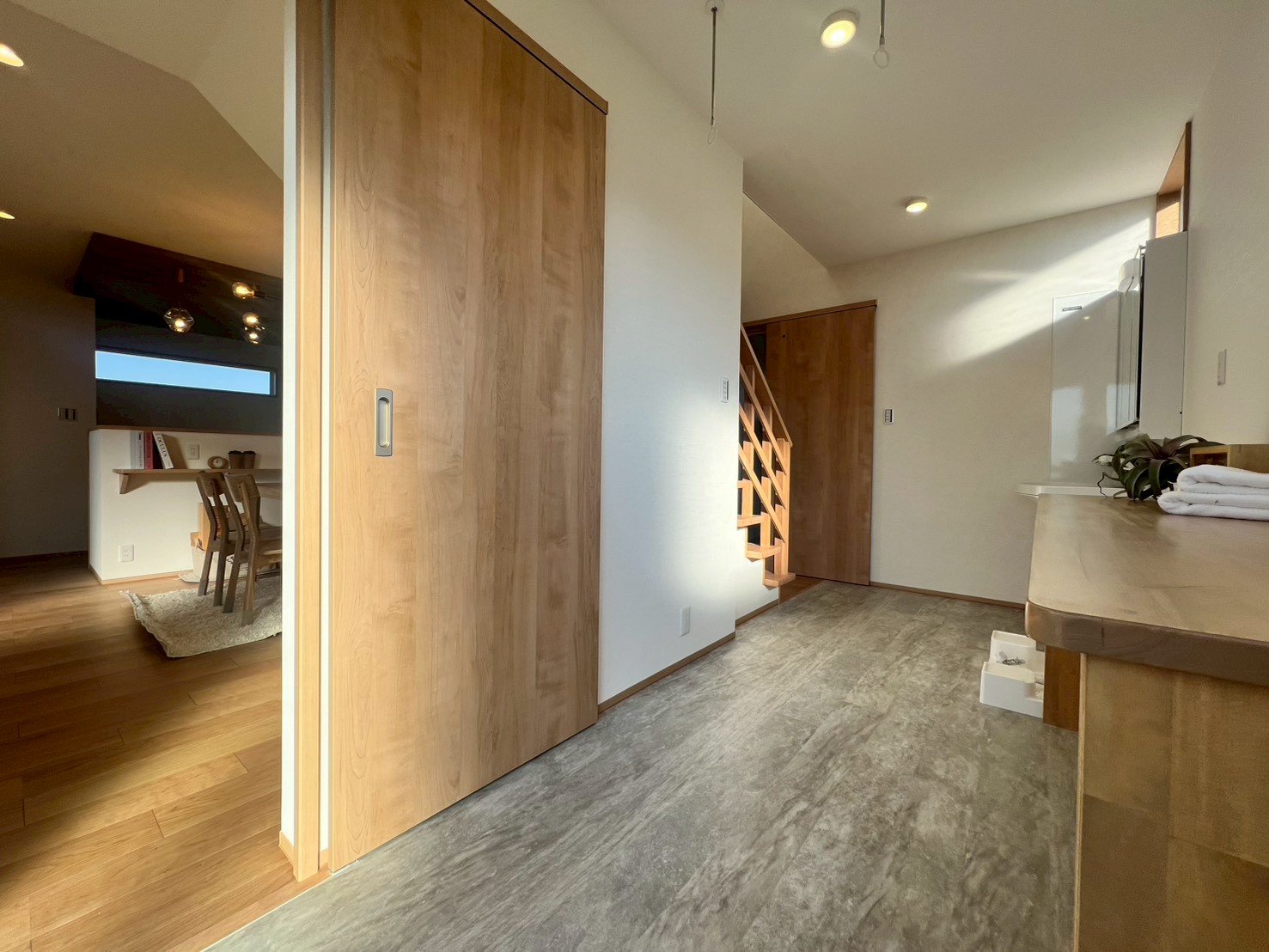 またはシューズクロークから真っすぐ洗面、浴室、トイレなどの水廻りへ