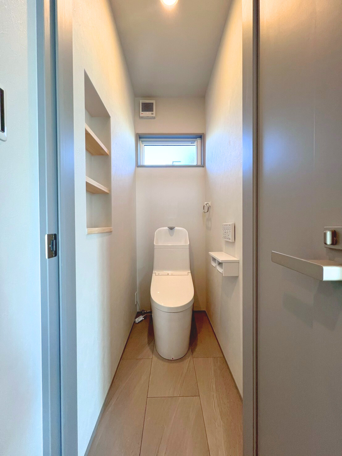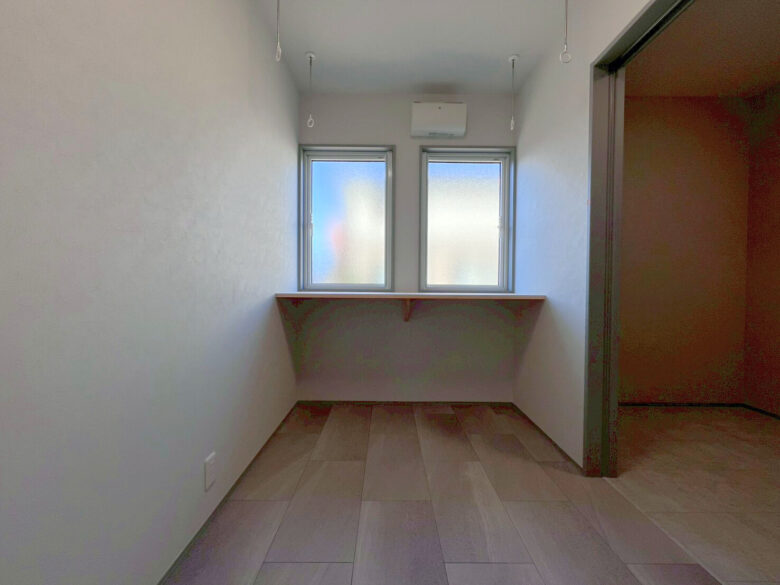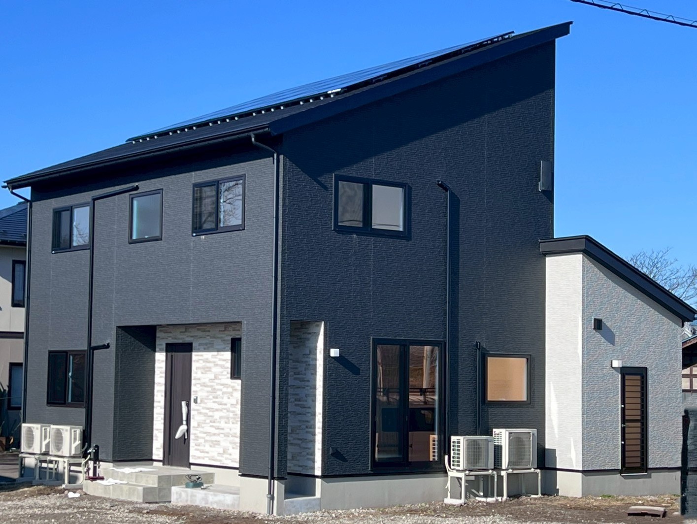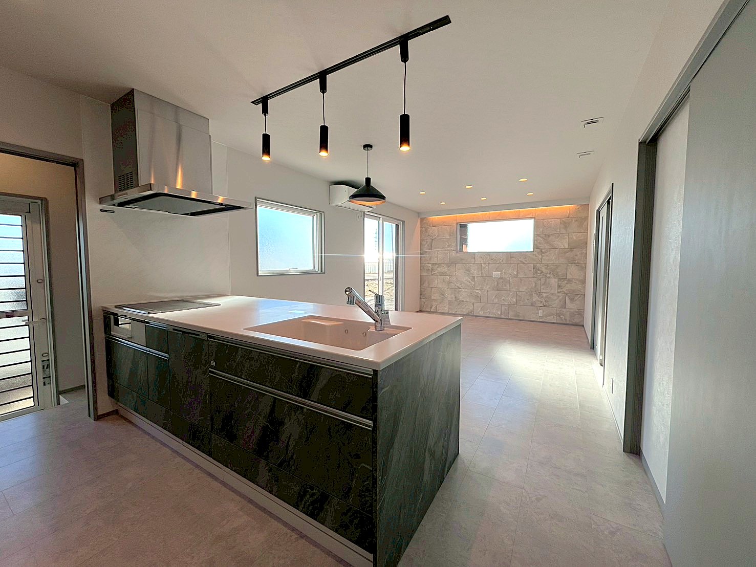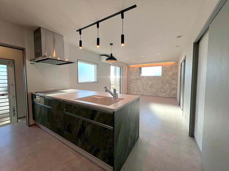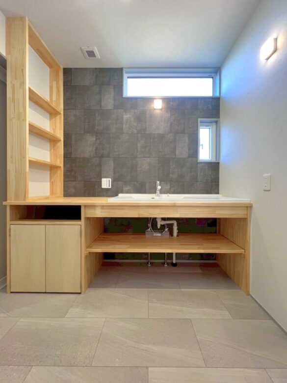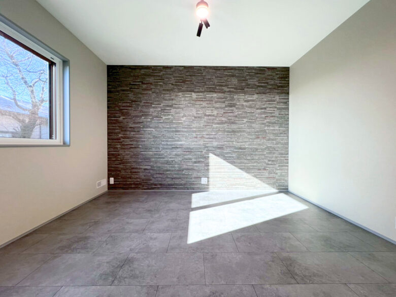 モノトーンで魅せる シンプルモダン 2026年2月26日2026年2月26日 家族構成 単世帯 建物構造 木造軸組SW工法 延床面積 138.16㎡ 41.78坪 坪単価 所在地 湯川村 ホワイト×ブラック×グレーでまとめたシンプルで 高級感のあるモダンスタイルのお家できました! モノトーンの中に、造作カウンターや収納などの 木目が加わり、硬すぎずほっと寛げる空間に仕上がりました 建物の特長 省エネ北海道基準以上の性能 長期優良住宅 耐震等級3 土台・柱 全て桧 LDK グレーとブラックでまとめたLDKは約16.8帖 写真左側、手前の扉は玄関へ 奥の扉は水廻りのある廊下へと続いており ぐるりと通り抜けできる回遊型の間取りです キッチン リビングのアクセントにはエコカラットを使用しています 床やキッチン、アクセント部分には石目柄を採用し、高級感のあるモダンなLDKに! キッチン収納 ハイドアで生活感をなくした背面収納 中には造作のカウンターと棚を設けて 家電や小物もすっきりしまえるようになっています 洗面脱衣室 造作の洗面台を設けた洗面脱衣室 洗濯カゴを出しっぱなしにしない、左下の扉が嬉しいポイント! 使ったタオルや脱いだ服も隙間からさっと入れられ、ごちゃごちゃしないのがいいですね♪ ランドリールーム 約3.5帖のランドリールーム 隣に続くWICも家事ラクポイント! 1F洋室 約7.7帖の多目的スペース グレーの床に濃いグレーのエコカラットで落ちつきのある空間に! 寝室 約8帖の寝室。正面の扉の奥には 約6帖のWICを設けました キッズルーム 約5.2帖のキッズスペースもグレーで統一! クローゼットには扉を付けずオープンタイプにしました トイレ すっきりシンプルにまとめたトイレ 外観 ブラック×グレーの外壁 玄関まわりには、石を積み上げたような濃淡が素敵な外壁を選びアクセントに!