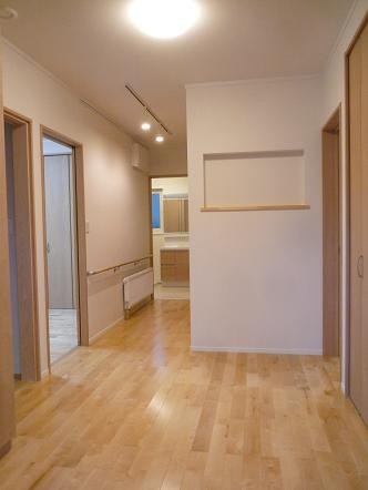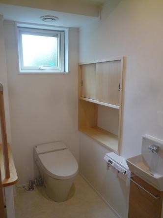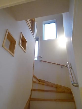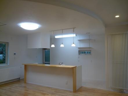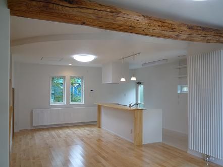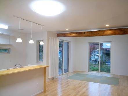 福島県会津若松市河東町 古材を利用した新しく懐かしい家 2023年12月6日2015年7月25日 家族構成 2世帯 建物構造 スーパーウォール工法2階建 延床面積 181.15㎡ 54.89坪 坪単価 万円/坪 所在地 福島県会津若松市河東町 平成25年度 若松建築業組合 住宅コンクール 新築部門 『最優秀賞』を頂きました! 建物の特長 ■高気密・高断熱 ■高耐震 ■高耐久 ■電化 ■省エネ 玄関ホールから廊下 廊下にヒートポンプを設けて部屋の移動も暖かく。 古材利用 以前住んでいた家の梁を再利用しインテリアに。天井の一部をRにしました。 リビング 広いLDKにはサクラ無垢材を使用。一部分を畳にして和の雰囲気です。 キッチン 対面式キッチンカウンターです。床部分はタイルにしました。 トイレ 手摺を付けて高齢者に優しく。収納があると便利です。 階段 階段に開口を付けて明かりとり。埋め込みの飾り棚がおしゃれですね。 ホール 階段を上がると奥にサンルームとカウンターがあります。 サンルーム 物干し竿を付けて洗濯物を乾かせます。 寝室 寝室はシックでモダンな内装です。