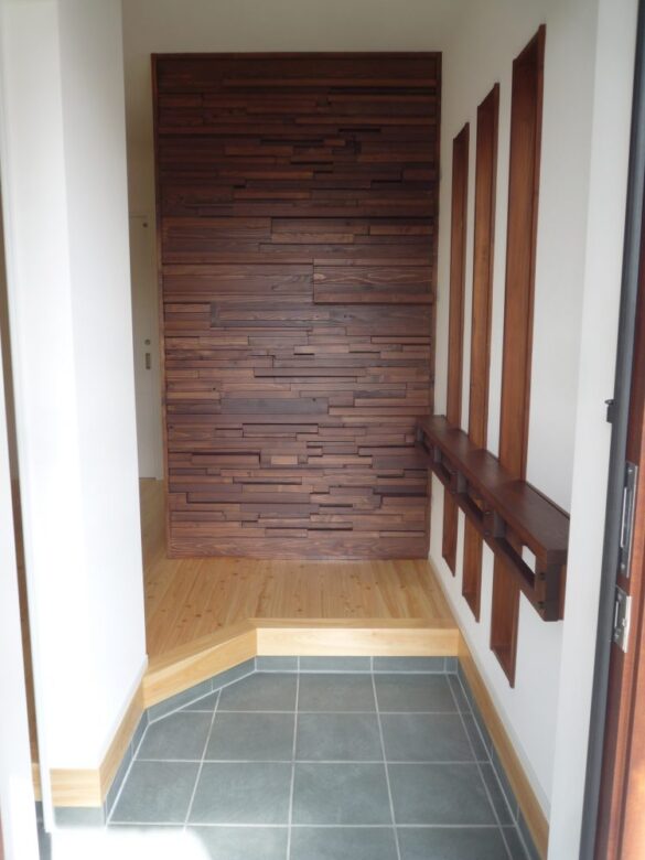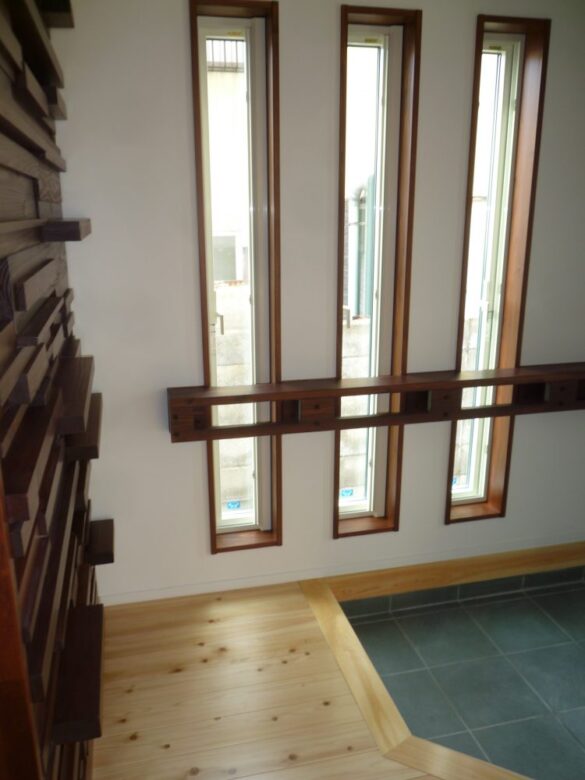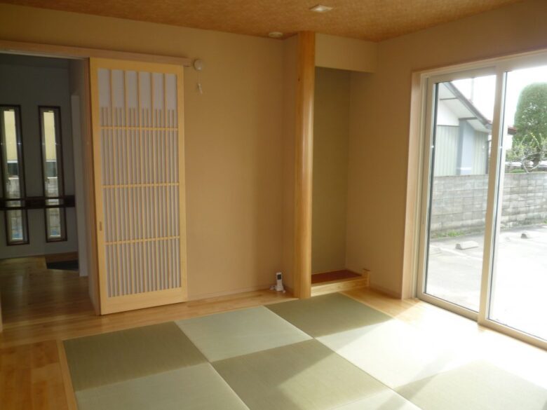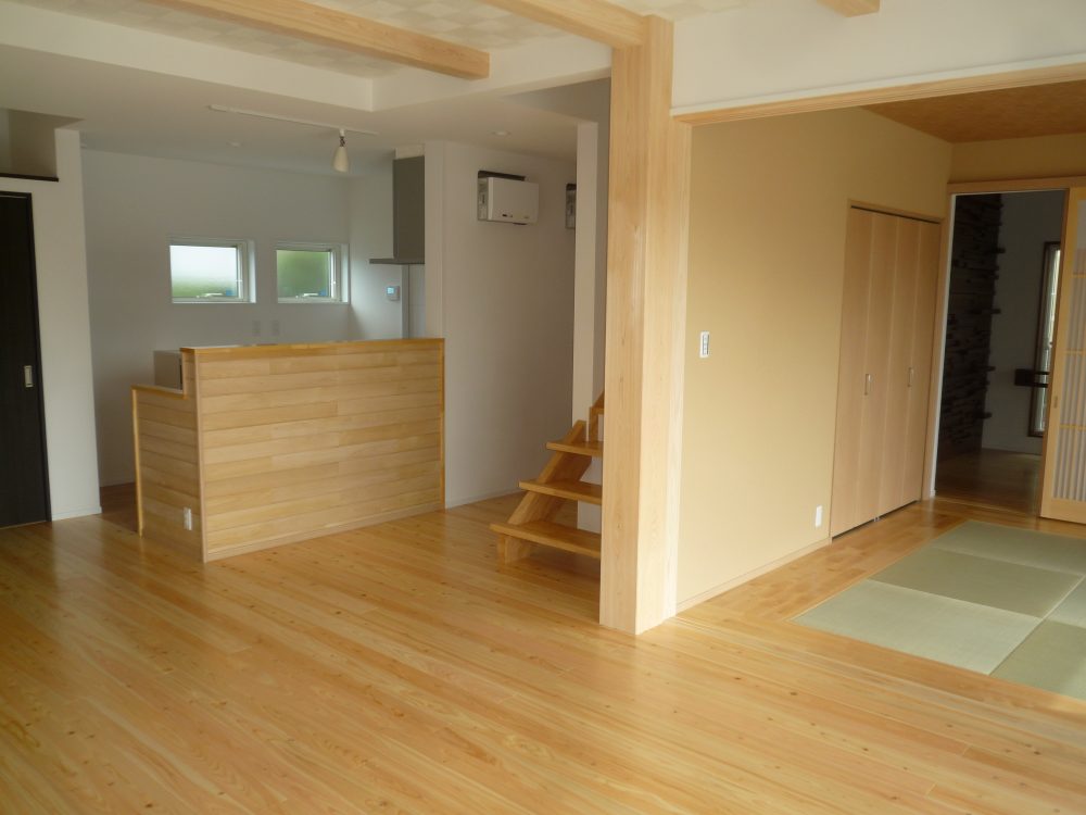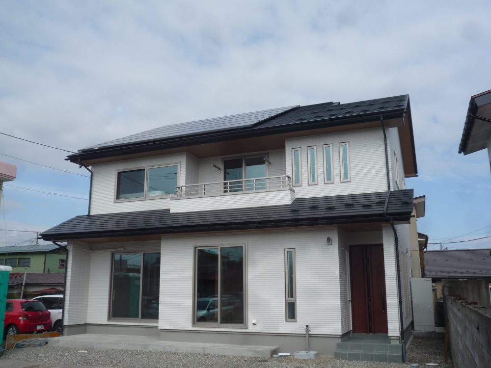 和モダンの内装!ゼロエネ・ZEHの家 2023年12月6日2017年11月15日 家族構成 単世帯 建物構造 スーパーウォール工法2階建 延床面積 145.54㎡ 44.10坪 坪単価 所在地 会津若松市湯川町 太陽光パネル6.48kW搭載。光熱費0以下!ゼロエネルギーの家 建物の特長 ■高気密・高断熱 ■高耐震 ■オール電化 ■太陽光 ■ゼロエネ 玄関 玄関ドアを開けると大きなダークブラウンの飾り壁でシックな空間に 玄関 LDK 床には桧無垢材を使用。飾り梁で木を基調とした和のテイストに仕上げました。 和室 リビングと隣接した和室には琉球畳を採用。小さな床の間もあります。 2階寝室 勾配天井には杉無垢貼り、広々とした空間、木目の天井で落ち着いた寝室に。 2階ホール ホールには飾り柱。奥に小さなフリースペース トイレ 造作のトイレ手洗いです。