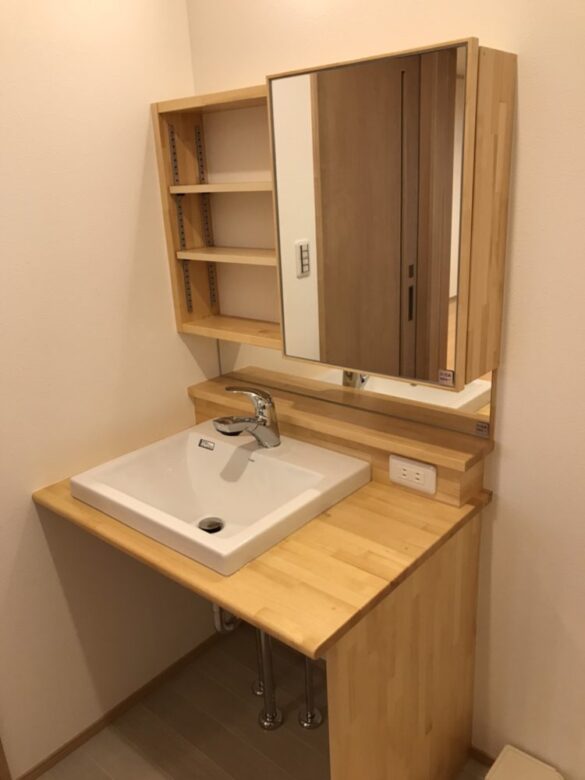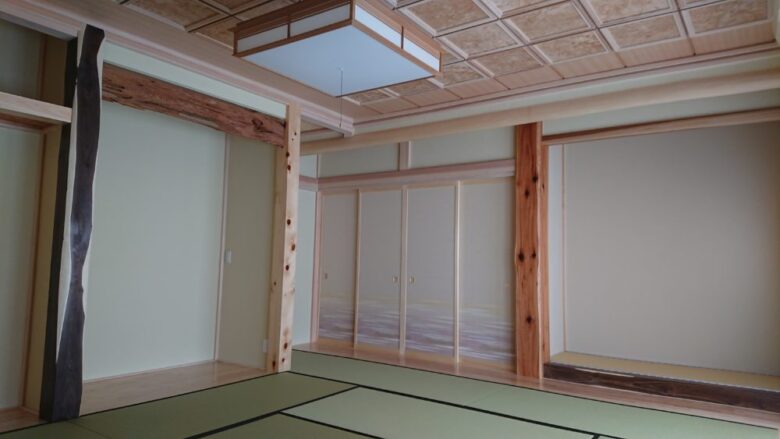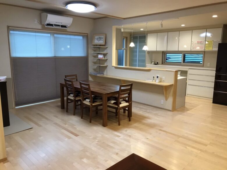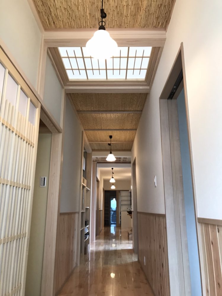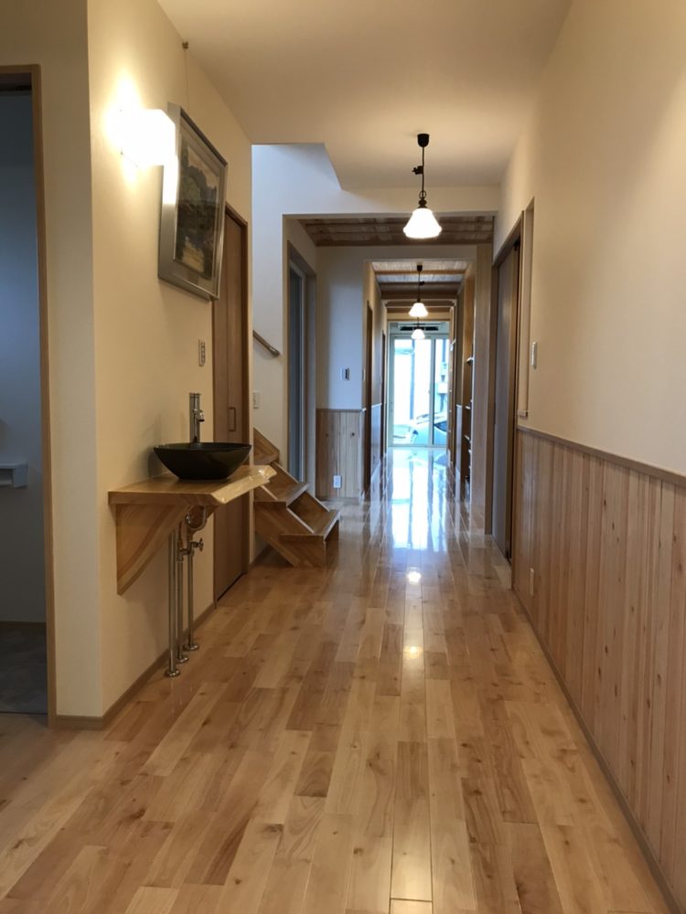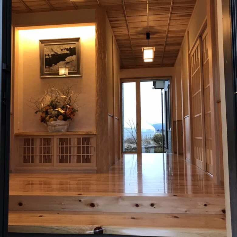 無垢材のぬくもりあふれる和モダンの家 2023年12月6日2020年4月2日 家族構成 二世帯 建物構造 木造軸組SW工法 延床面積 244.01㎡ 73.95坪 坪単価 60万~ 所在地 喜多方市 無垢材をふんだんに使用した木のぬくもりを感じる二世帯住宅。 桧の5~6寸柱多数使用。 長期優良住宅。 建物の特長 来客をもてなす和の玄関 桜無垢の床、上がり台には桧の一枚板。 杉の無垢板天井、桧無垢の腰板。杉絞り丸太や、櫟(イチイ)の柱等、無垢材をふんだんにあしらった和の玄関。 和室 格天井、槐(エンジュ)、日光杉、桧の6寸床柱等、お客様の想いの詰まった本格的な和室。 LDK 2世帯で集まっても広々!約23帖のLDK。キッチン横には大容量の収納。 LDKの周りには、勝手口、洗面、浴室が配置され、家事の流れもスムーズに。 廊下 東西に抜ける廊下。床板は桜無垢。腰板には桧を採用。 和の雰囲気に合わせた造作の手洗い器も設置。 廊下 天井の一部に葦を、吹き抜け部分に障子をあしらい、和室に隣接する廊下をおしゃれに演出。 ライトは旧家で使用していたもの。 造作洗面台 毎日使う小物は鏡の裏に隠し、すっきりとした洗面に。 造作洗面台 外観