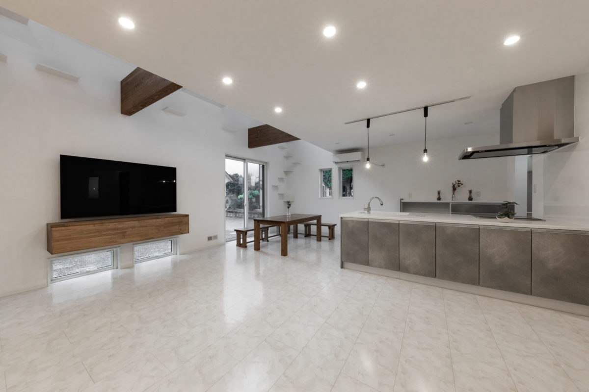 左手には造作のTV台。梁やダイニングの色とあわせました✼