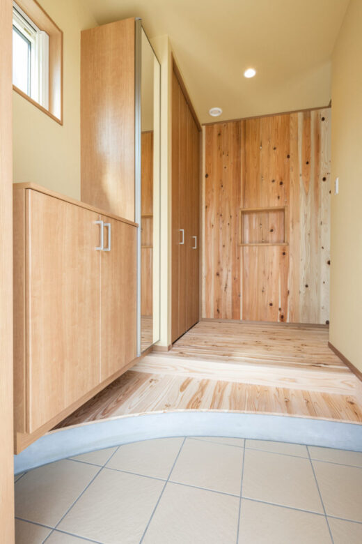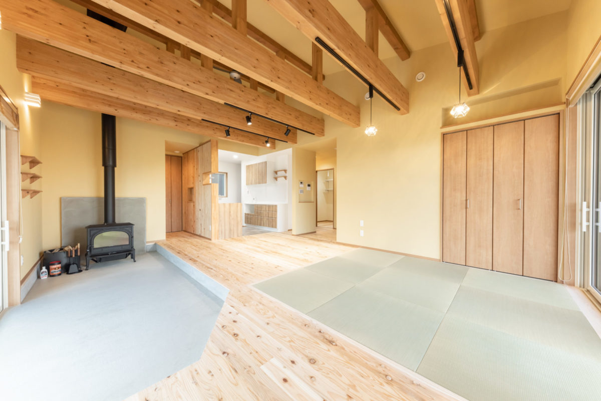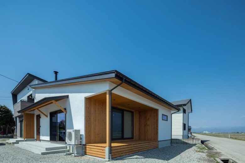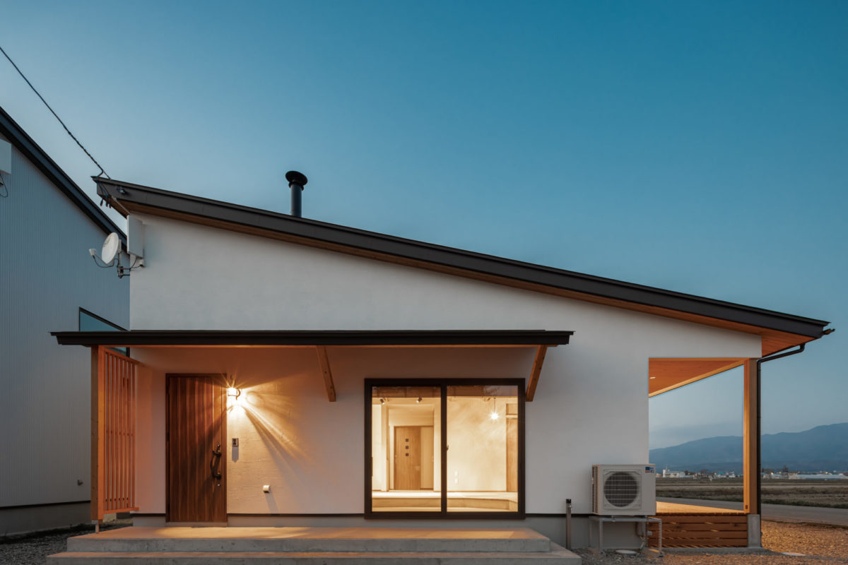 磐梯山を望む 薪ストーブのある平屋のお家 2023年12月6日2021年5月1日 家族構成 単世帯 建物構造 木造軸組SW構造 延床面積 72.04㎡ 21.84坪 坪単価 55万~ 所在地 湯川村 無垢材のぬくもり。薪ストーブの火の揺らぎ。デッキから眺める磐梯山。 ご夫婦二人の癒しの空間が完成しました! 建物の特長 土台・柱全て桧の4寸 北海道基準以上の性能 長期優良住宅 外観 真っ白な塗り壁に、無垢材を貼った軒天や、デッキがいいアクセントになっています。 青空に映える素敵な外観です! エントランス 帰った瞬間から無垢材のぬくもりに包まれるエントランス。 L.D.K 広々とした土間と畳コーナーのあるL.D.K。 開放的な勾配天井に、連なる梁が印象的です。 ウッドデッキ 畳コーナーから外に繋がる、ウッドデッキ。 磐梯山をバックに日々の移り変わりが楽しめます。 ご夫婦で「最高の眺め!」と景色を楽しまれているそうです。 薪ストーブのある暮らし ご主人のご希望だった薪ストーブ。 広々とした土間は、薪や薪ストーブ用品を並べたり、イスを置いたりと趣味と寛ぎのスペースに! オリジナルの洗面台 奥様お気に入りの照明の光が反射して、幻想的な空間に仕上がった洗面スペース。 アールにした角が柔らかな印象の棚や、小物置など、お施主様のご要望に応じて造作したオリジナルの洗面台です。 うづくりの床 柔らかく、浮き出た木目が素足に心地良いうづくりの床。 冬は暖かく、夏はひんやりと素足での生活が楽しめます。 トイレ トイレの壁、床にも無垢材を採用しました。 キッチン 玄関ホールの裏側に位置するキッチン。 来客の際に、チラッと様子がうかがえる小窓がポイント! 外観-2 夜になると、照明が柔らかく照らし、上品でやさしい雰囲気に。