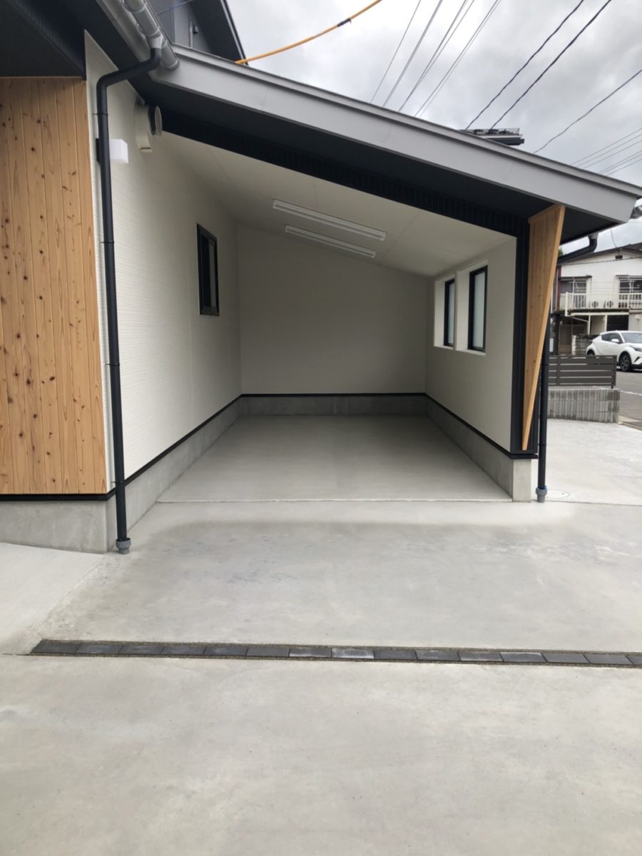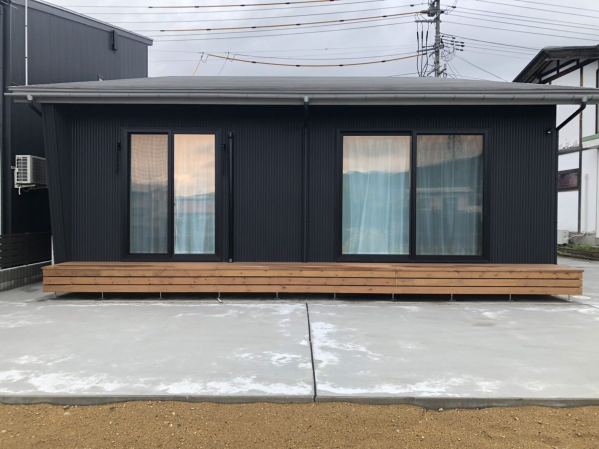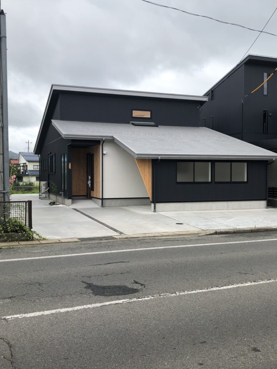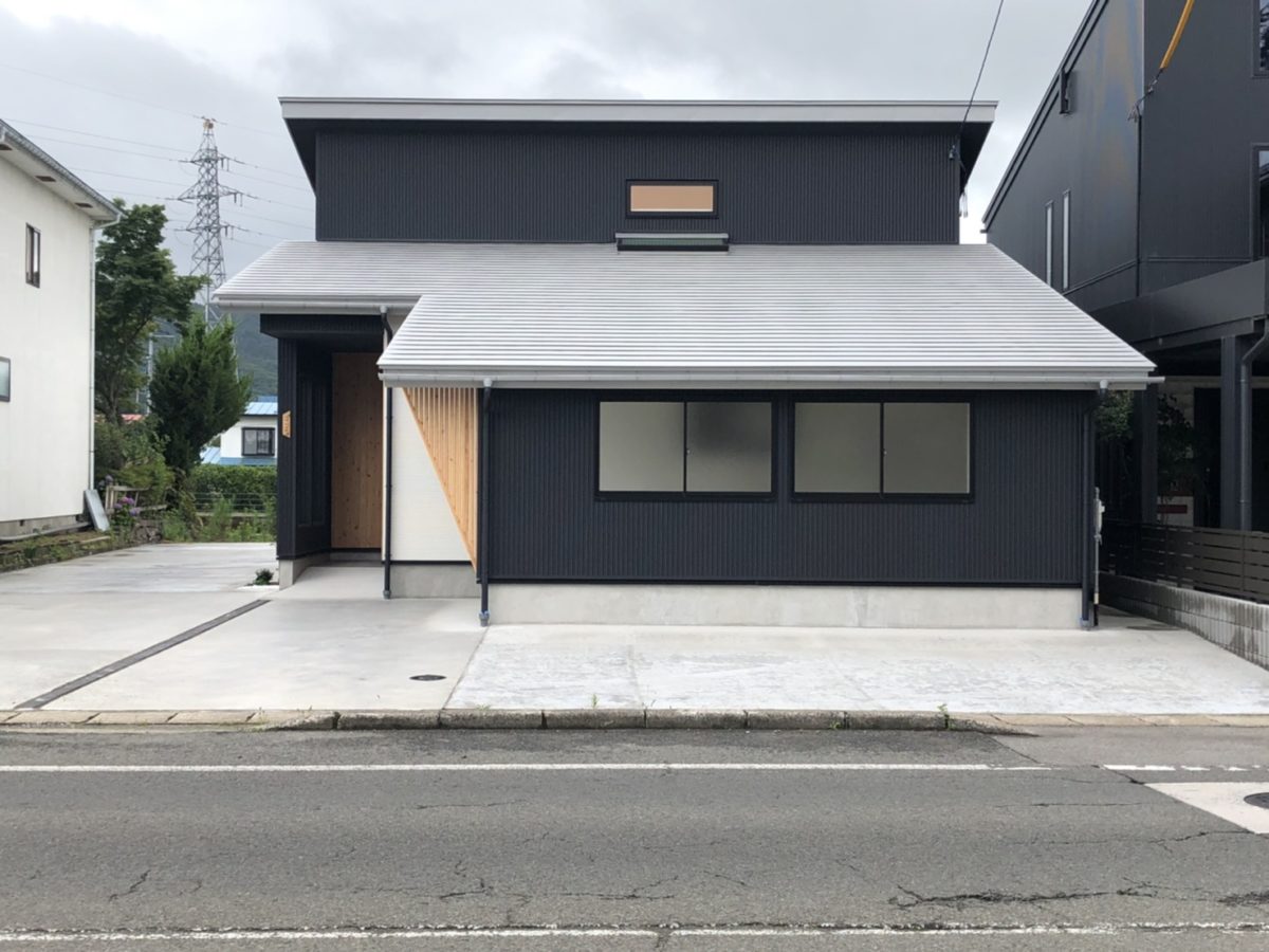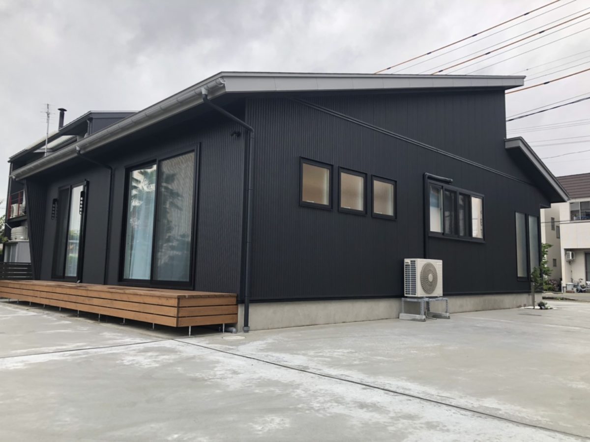 ✼ 黒のガルバリウムに無垢材、斜めの袖壁が印象的な外観