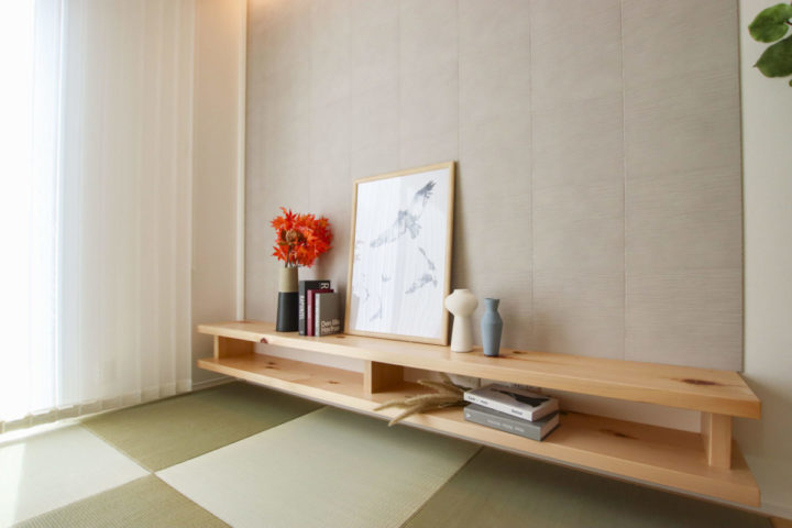 写真下は、ダイニング隣の畳スペースに設けた造作のTV台です。