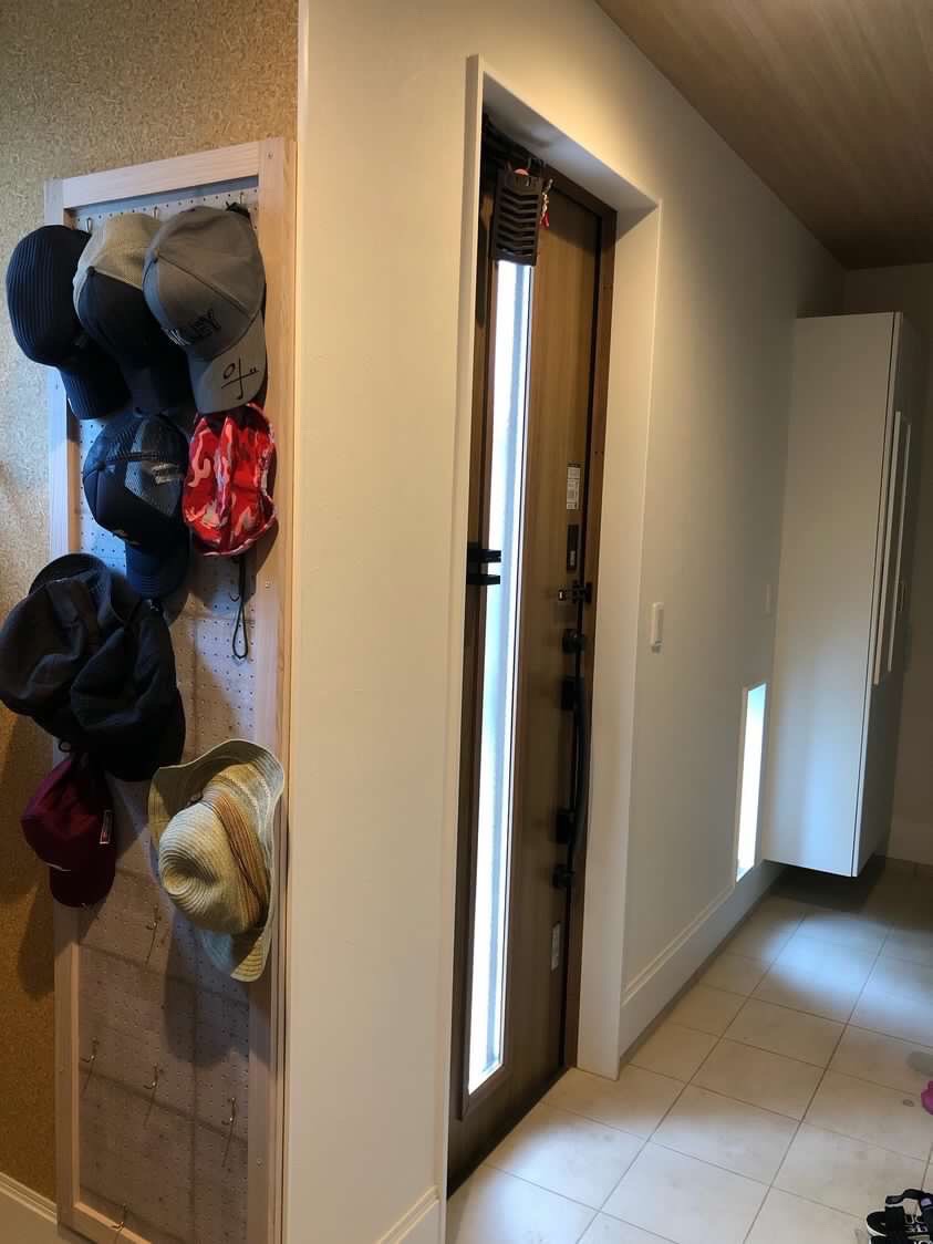 玄関から続く土間収納は一部に造作棚を付けていましたが、壁面を利用した帽子掛けスペースを作って大正解ですね✧⁂✧