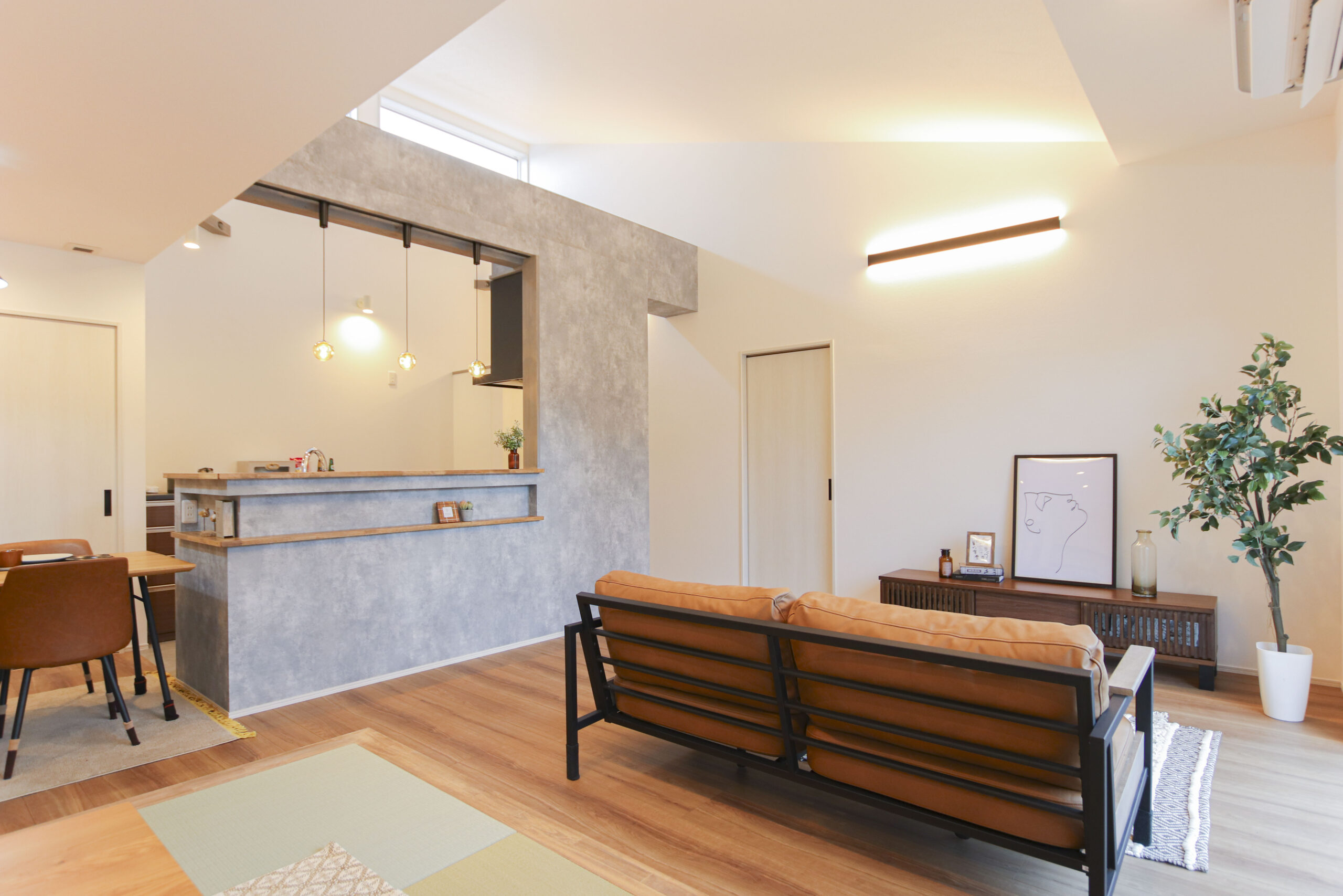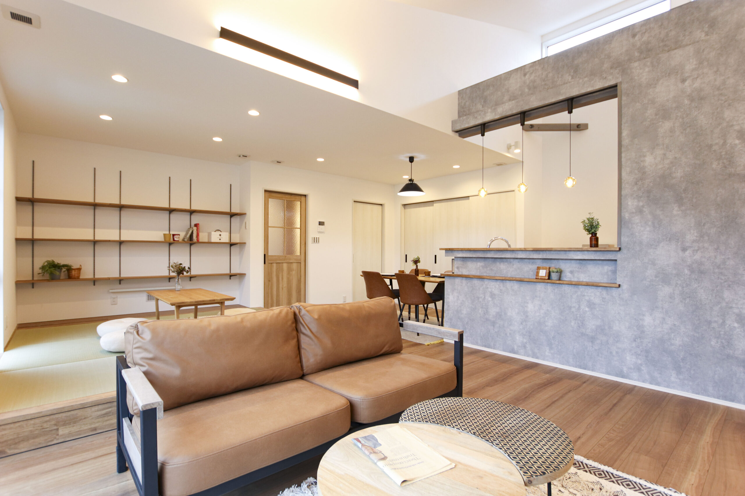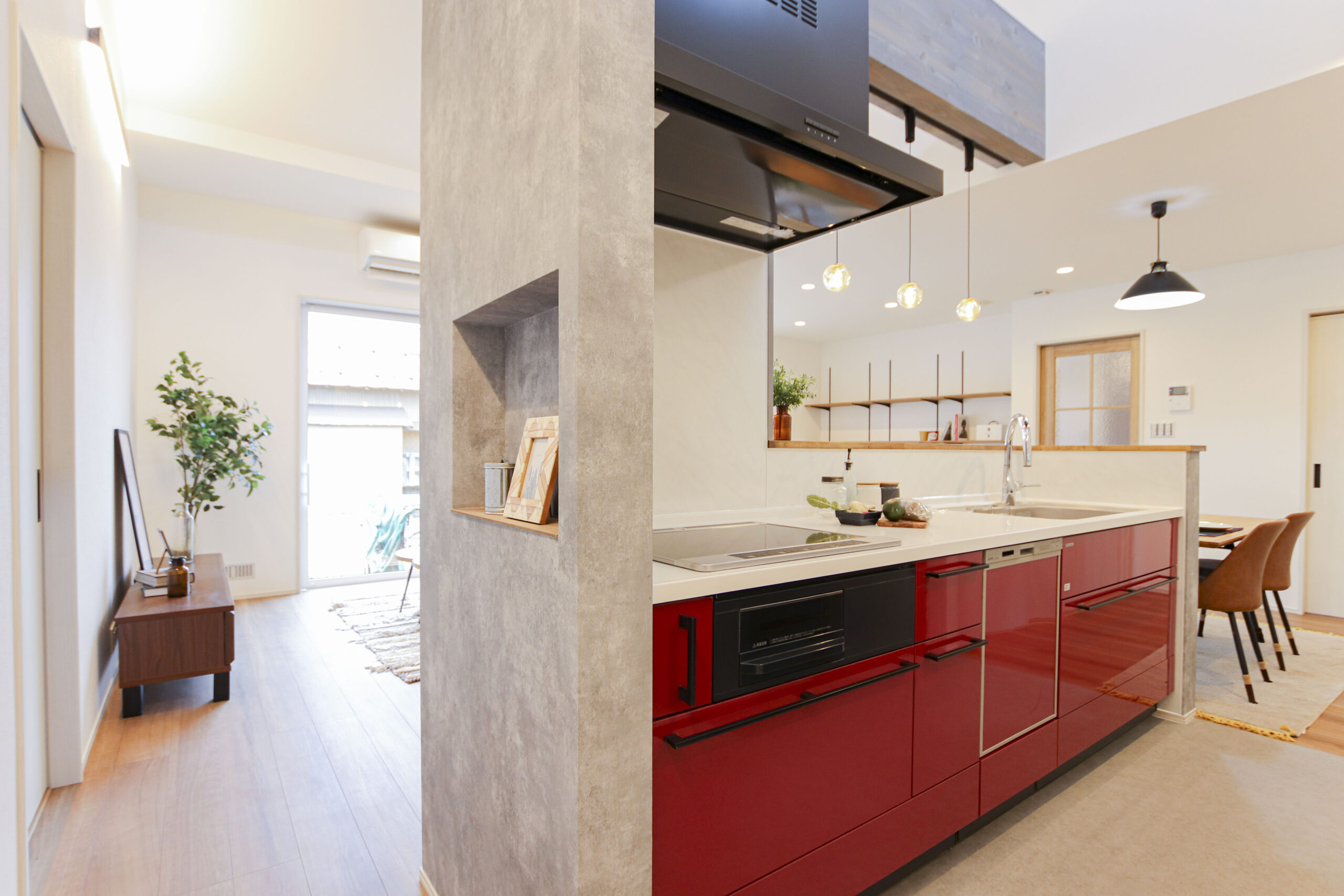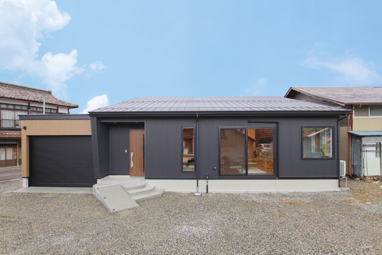 インナーガレージ+平屋の住まい 2025年9月11日2024年1月16日 家族構成 単世帯 建物構造 木造軸組SW工法 延床面積 120.07㎡ 36.39坪 坪単価 所在地 会津美里町 車を降りてそのまま室内へ! インナーガレージのある平屋のお家、できました* 建物の特長 北海道基準以上の性能 ( C値0.26 UA値 0.46 ) 長期優良住宅 耐震等級3 土台・柱 全て桧 エントランス 玄関右手には造作の飾り棚 左にはガレージへの入り口と シューズクロークを設けました 普段は左側から出入りし、正面を来客用とすることでいつでもスッキリした玄関を保てます! 造作手洗い 廊下にある格子の先には、造作のL型カウンターと手洗いを設けました。 ただいま手洗いとしても、お出かけ前の身だしなみのチェックにも! LDK 勾配天井で開放的な約18帖のLDK 約5帖の小上がりは、お子様の遊び場としても 寛ぎのスペースとしても◎ ダイニング ダイニングはキッチンと横並びにしてスッキリと! キッチン前にはちょっとした小物が置けるニッチを設けました 写真左側・・3枚引き戸でスッキリとしまえるパントリーで生活感を感じさせない工夫も! キッチン 落ち着いたグレーのアクセントクロスの裏には 鮮やかな赤いキッチンが! キッチンをぐるっと通り抜けでき、そのまま水廻りへ通じる 回遊動線で家事の負担も軽減* 洗面脱衣室 脱衣室も兼ねた洗面室は広めの造作洗面台を採用し収納力もアップ! WIC 脱衣室の隣には約3帖のWICを設けました 洗面脱衣室➯WIC➯ランドリールームと 一直線にまとまっており、 洗う、干す、しまうまでが最短距離で完結できます! ランドリールーム 約3帖の広々ランドリールームで 毎日のお洗濯も安心です! LDK-2 キッチン中心に、ダイニング・小上がり・ソファーと配置されたLDK 家族の気配を感じながらも、それぞれの時間を過ごせます 外観 ブラックと木目を基調とした外観 左手側のインナーガレージから直接室内に出入りできます!