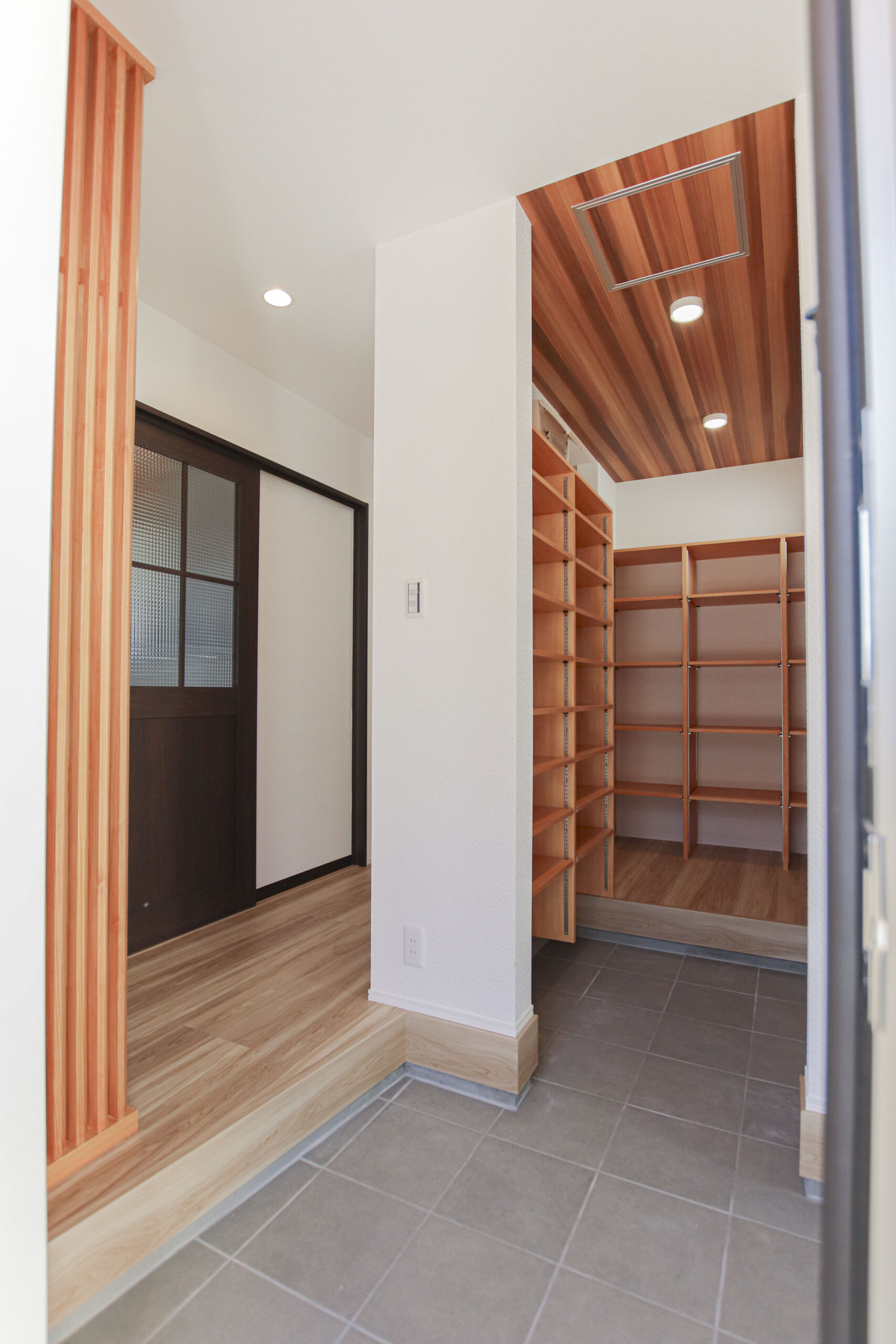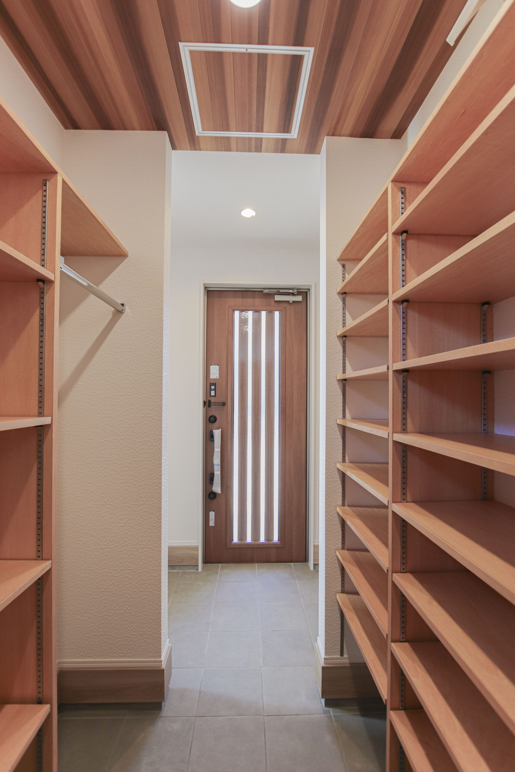 玄関廻りがごちゃつかない、通り抜けできるシューズクローク! 帰宅後、上着や小物などを収納しながら・・➯