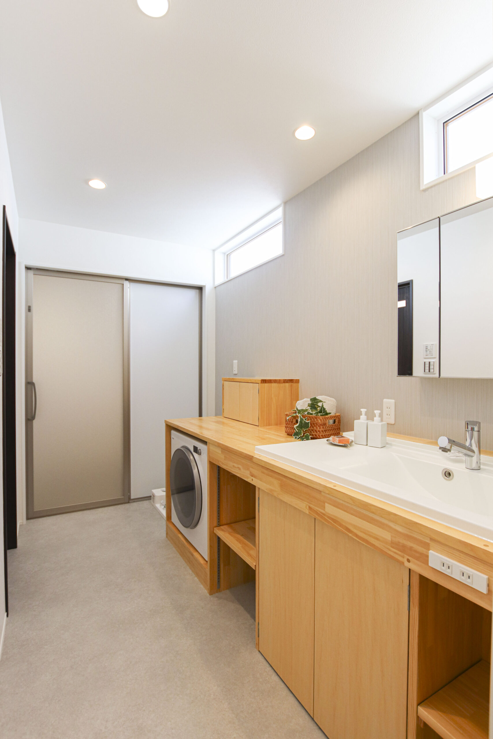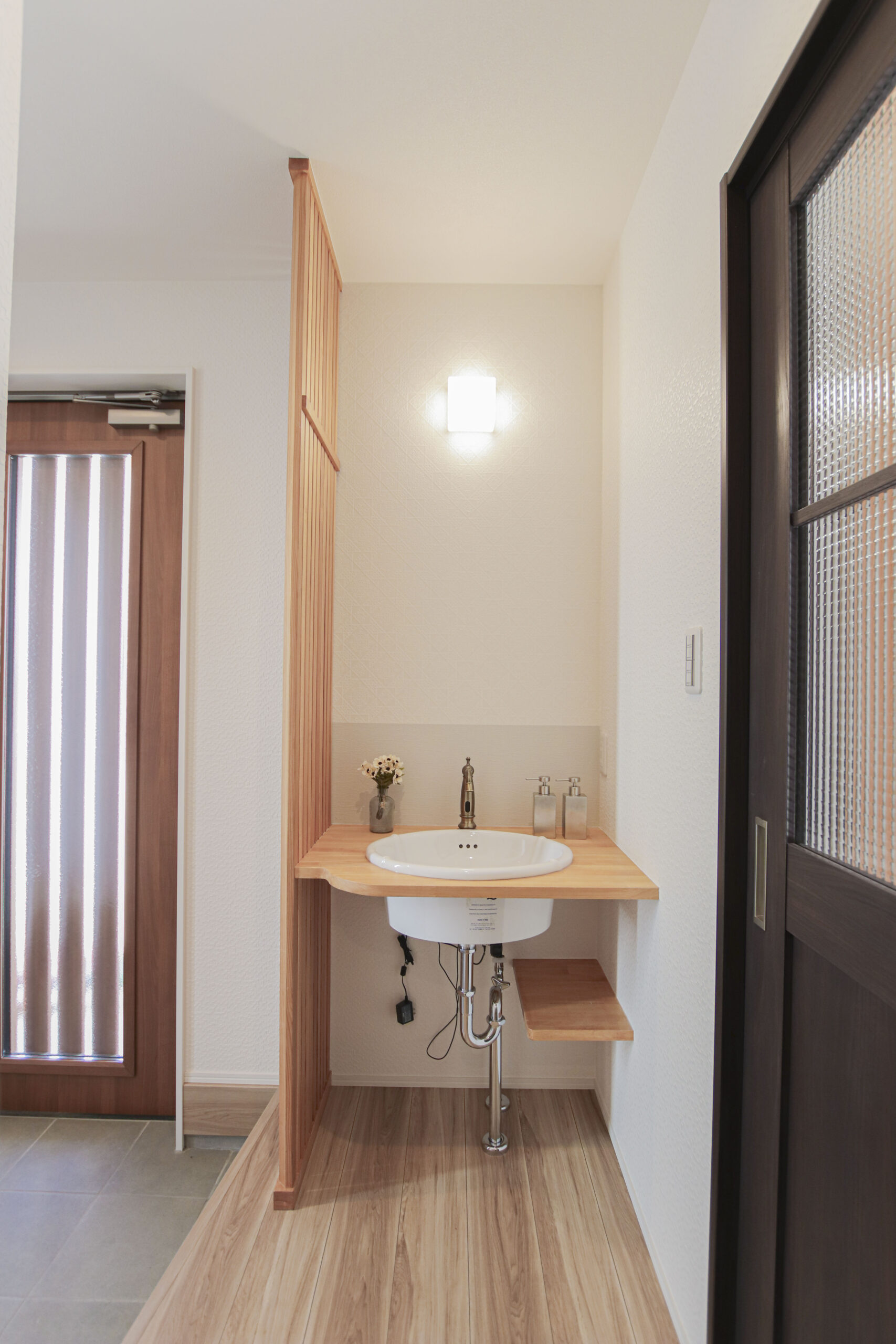 造作の手洗いはさっと使えて便利ですが、来客時に直接見えない工夫も*
