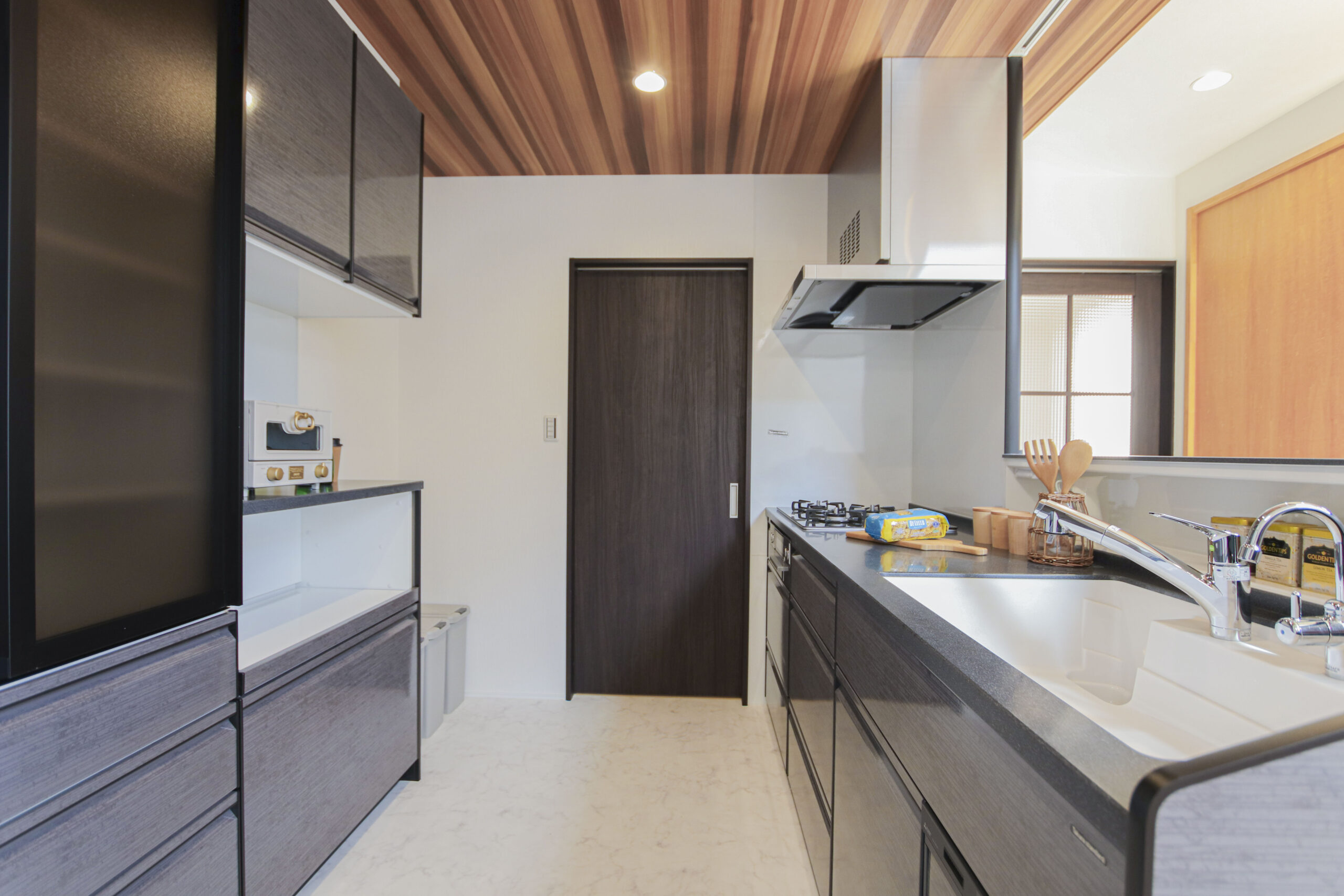 キッチンと収納をグレーで揃えた、シックな印象のキッチン