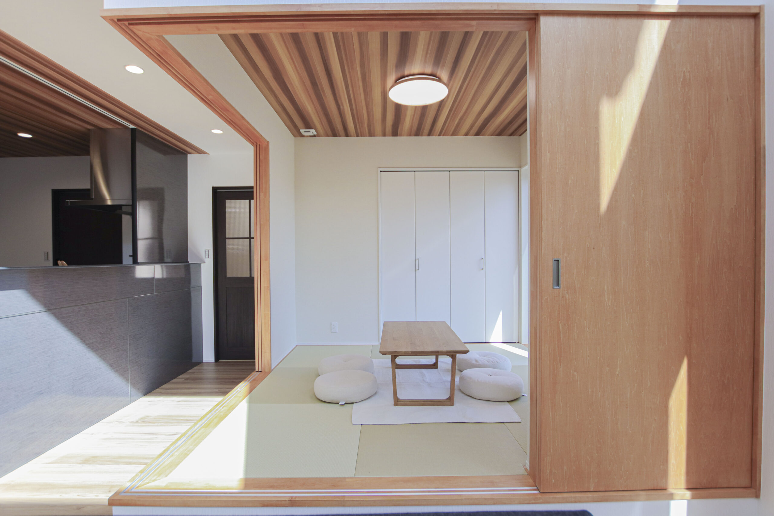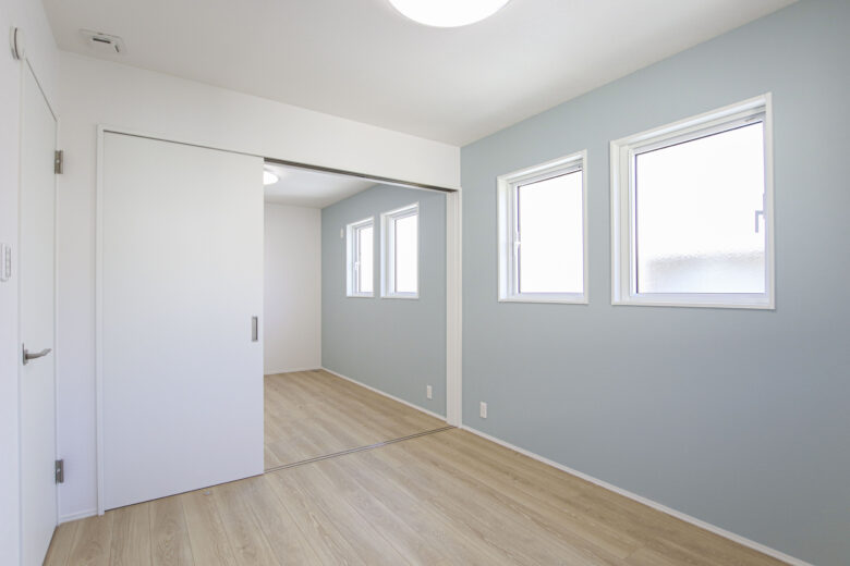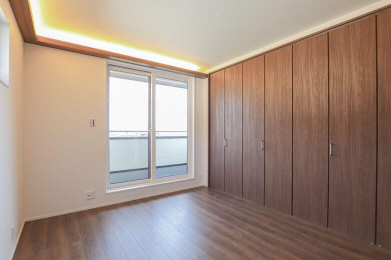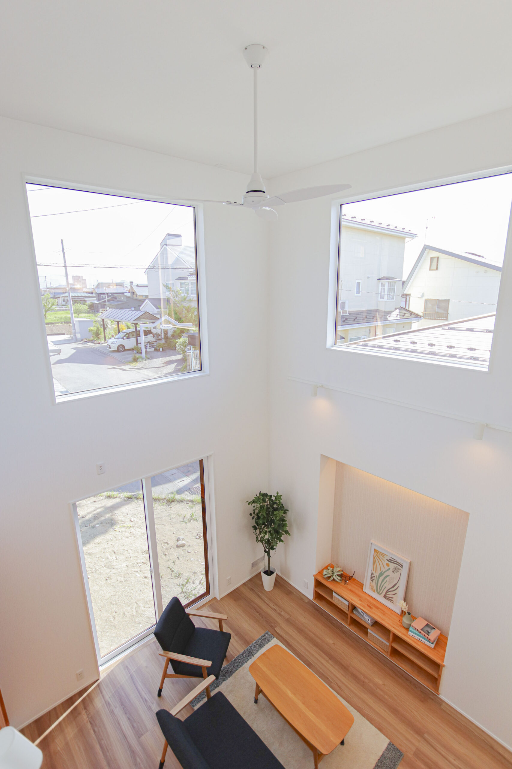 白と明るいブラウンを基調とした室内に入ると、大きなFIX窓がお出迎え!