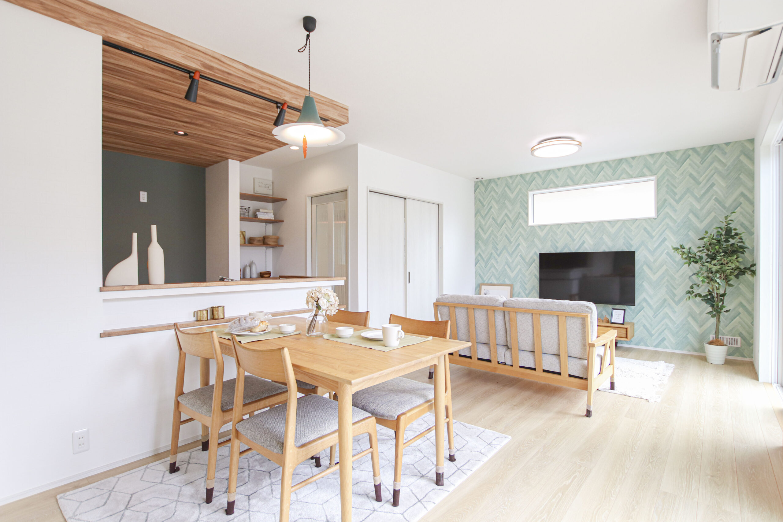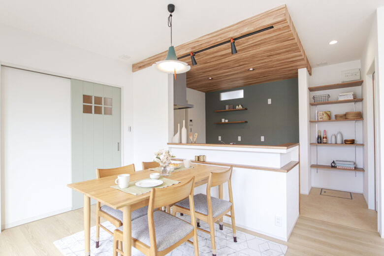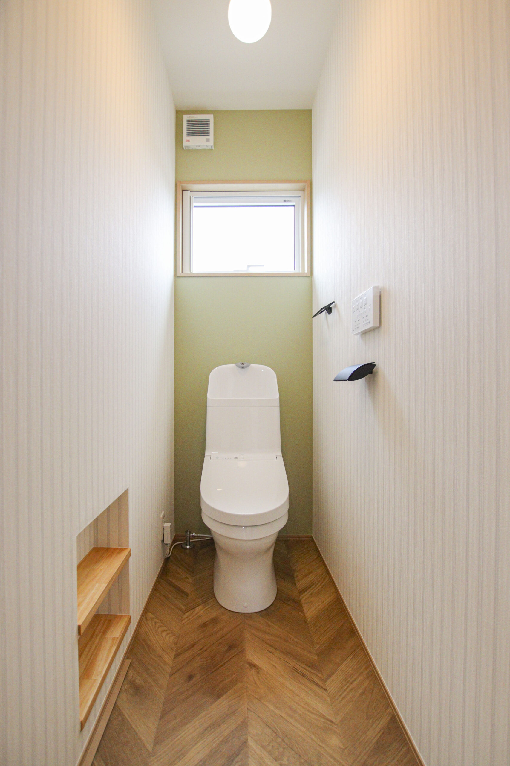 “家族4人にちょうどいい” シンプルスタイルのおうち 2024年9月7日 家族構成 単世帯 建物構造 木造軸組SW工法 延床面積 110.13㎡ 33.38坪 坪単価 所在地 会津若松市 4LD+ファミリークローク×2! 水廻り動線をコンパクトにまとめた ❞家族4人にちょうどいい❞ シンプルスタイルのおうちできました! 建物の特長 北海道基準以上の性能 (UA値 0.41 C値 0.29) 長期優良住宅 耐震等級3 土台・柱 全て桧 エントランス 造作の飾り棚と格子が出迎える玄関ホール 圧迫感を感じさせることなく、プライベート空間から視線を逸らすことができちゃいます お気に入りの小物を飾って楽しめるのもいいですね♪ リビング グリーンのアクセントクロスが爽やかなリビング 左手には約5.3帖の洋室を設けました 1F洋室 お子様の遊び場としてはもちろん、 扉を閉めると個室にできるので ワークスペースや来客用など、多用途に使えるスペースです! ダイニング 建具や照明、アクセントクロスをグリーンでまとめたダイニング 腰壁にはニッチを設け、小物置きに* 水廻り アールが可愛い壁の先には水廻りがまとまっています 洗濯➯浴室乾燥➯約2.5帖のファミリークロークへ! 写真左からファミリークローク➯洗面➯ 脱衣室(洗濯機)➯浴室と続き、洗って~しまうまでが3歩で完結する家事ラク動線です♪ ファミリークローク ブルー系でまとめた約2.5帖のファミリークローク 2Fトイレ 明るいグリーンとヘリンボーン調の床が可愛い2Fトイレ 足元に設けたニッチは、トイレットペーパーや小物置きとしても♪ 寝室 モスグリーンが落ち着いた印象の約7.2帖の寝室 WIC 2F廊下に設けられたオープンタイプのWIC 家族それぞれが必要な時にさっと使えていいですね! 外観 メインはシンプルなホワイト 出窓やドアにはブラウンを 屋根にはグリーンを取り入れ ナチュラルながらも目を引く外観に*